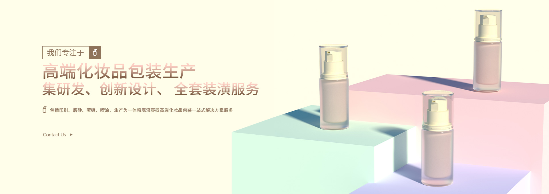 集研發(fā)、創(chuàng)新設(shè)計、 全套裝潢服務(wù),包括印刷、磨砂、噴鍍、噴涂,生產(chǎn)為一體粉底液容器高端化妝品包裝一站式解決方案服務(wù)。